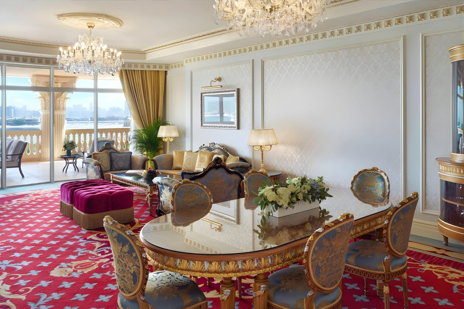 The guest rooms at Raffles The Palm reflect a refined blend of European artistry and contemporary comfort. Each space is adorned with bespoke Italian furniture, intricate gold and silver leaf detailing, and rich fabrics in soft, regal tones. Polished marble surfaces, crystal chandeliers, and handcrafted joinery elevate the sense of grandeur, while panoramic views of the Arabian Gulf complete the experience of palatial serenity.